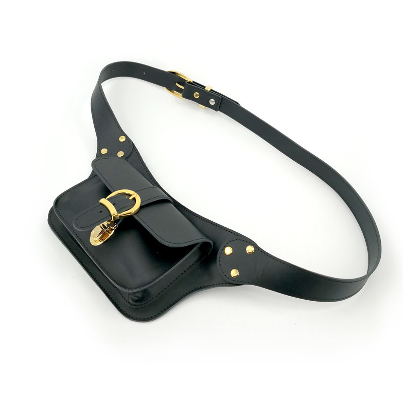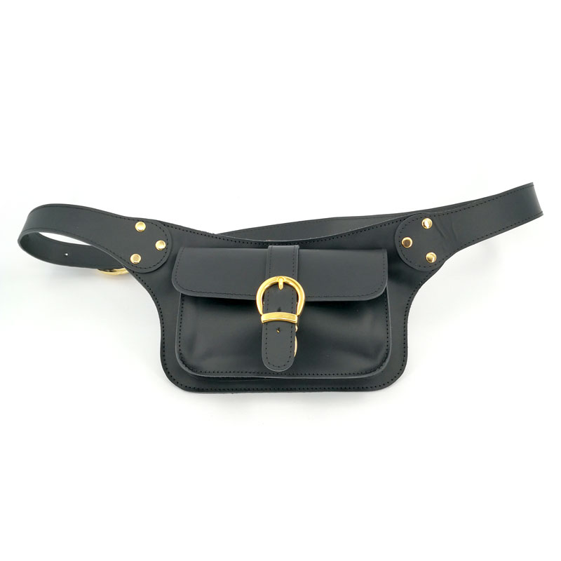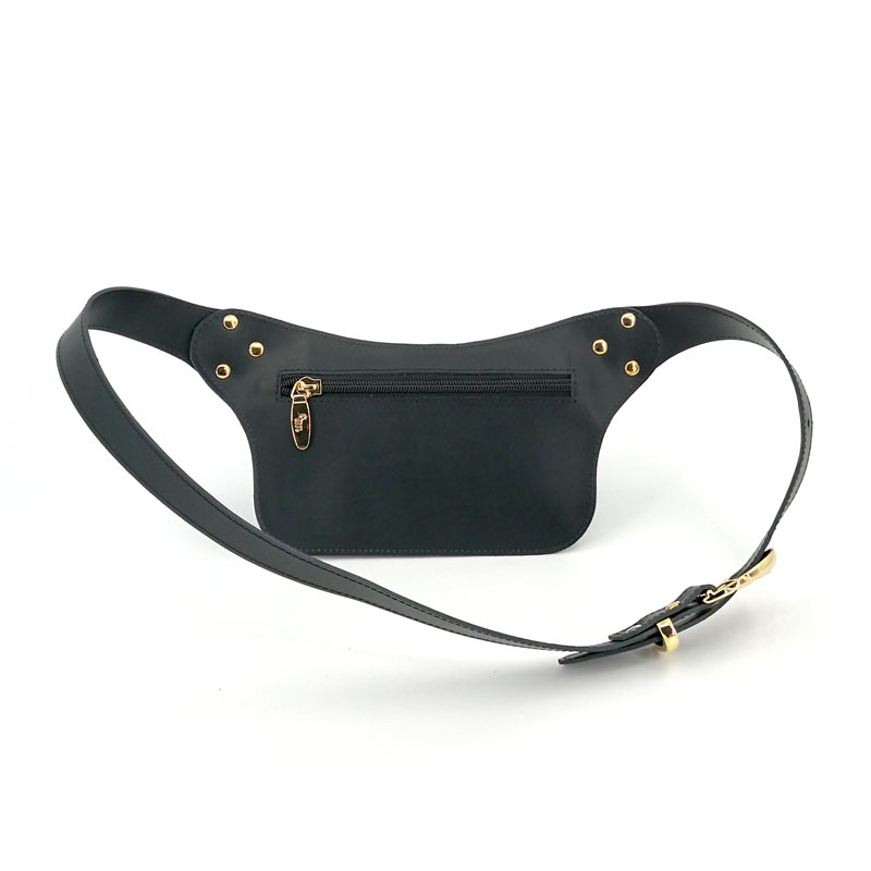 Hermoso y práctico banano confeccionado en cuero negro con aplicaciones de tachas doradas.