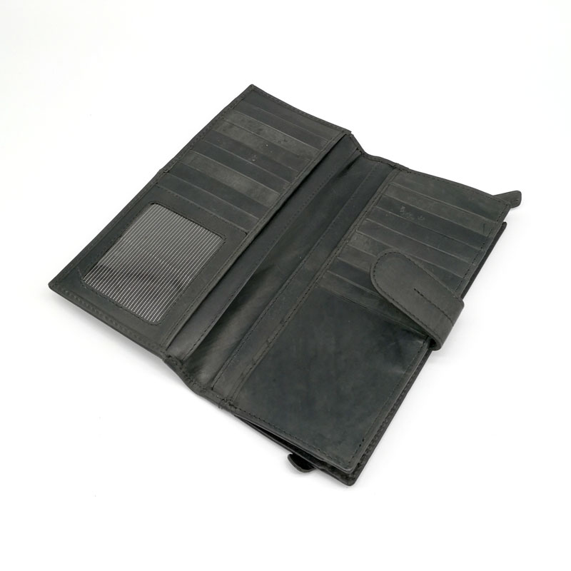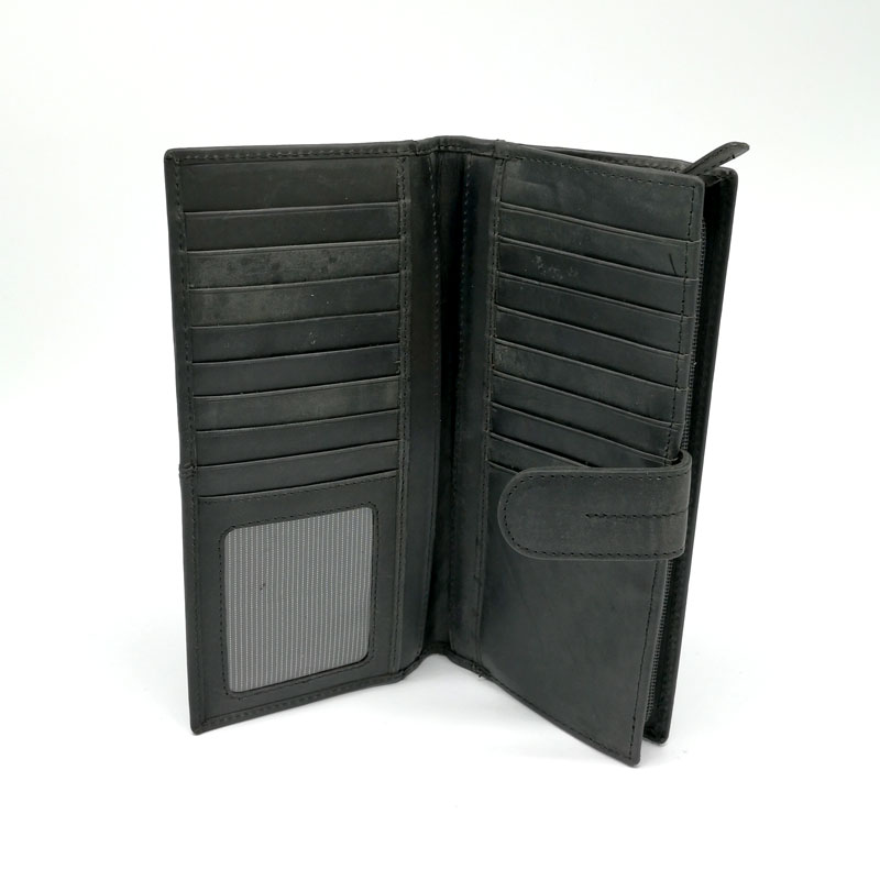 Billetera rectangular tipo chequera confeccionada en cuero liso encerado en color café y negro importada.