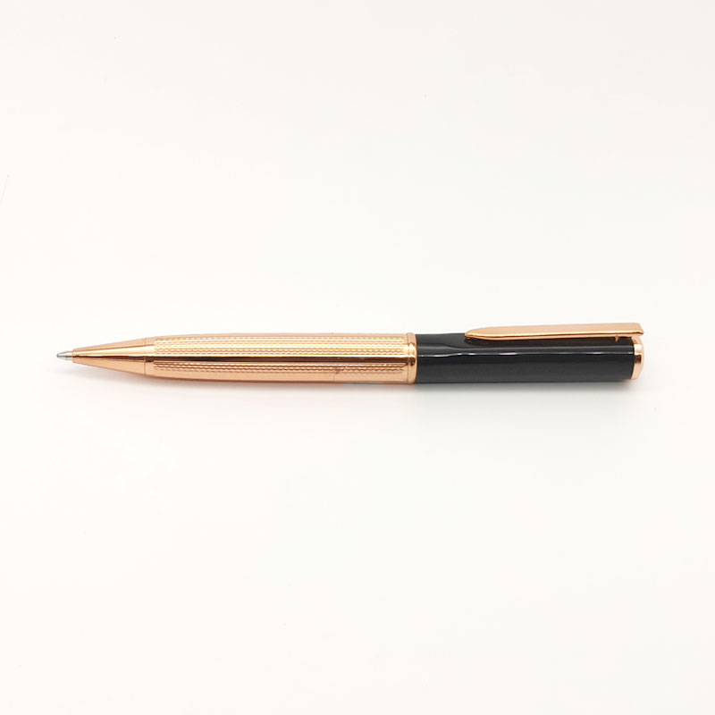 Bolígrafo negro con cobre en punta, clip y empuñadura cobrizados, cuerpo superior negro. Punta acción giratoria. Empuñadura texturada. Medidas: 14,5 cm. de largo total.