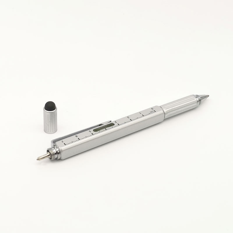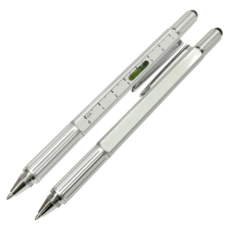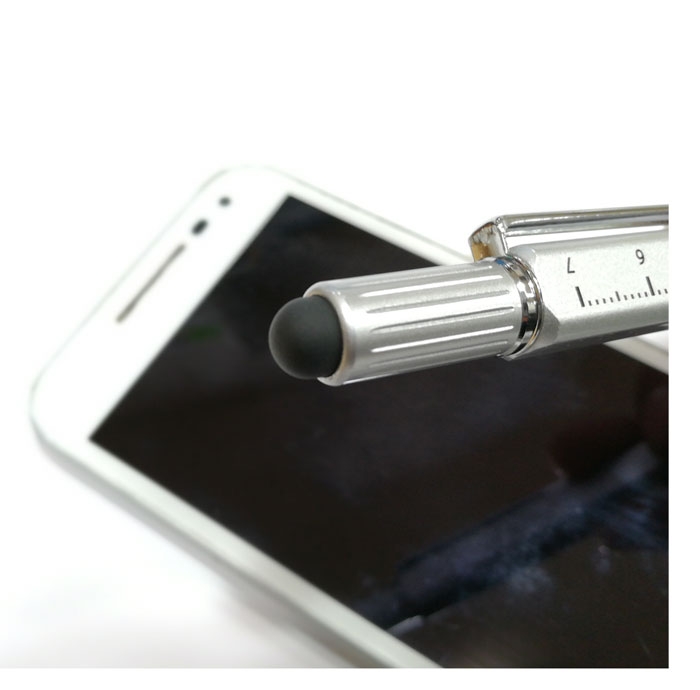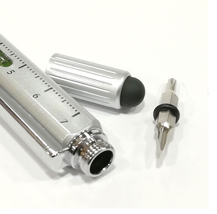 Práctico bolígrafo plateado con punta giratoria, Stylus, regla, nivel, y destornillador paleta y cruz mini en extremo superior. El mini destornillador se encuentra dentro del lápiz debes sacar la tapa con stylus. Además su cuerpo negro y forma cuadrada lo hacen un lápiz elegante al mismo tiempo una gran herramienta.