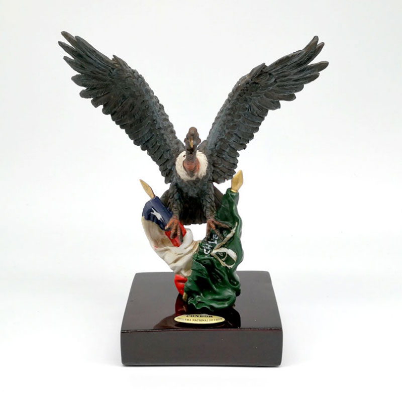 Estatuilla cóndor chico, con bandera de Chile y Bandera Carabineros. Dimensiones: 19 x 16,5 x 9 cms,