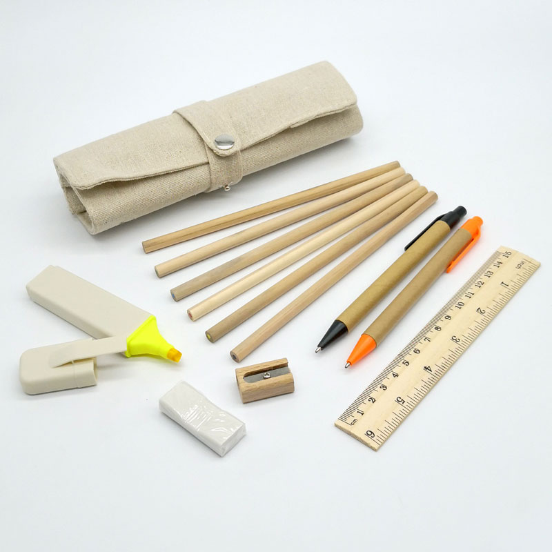 Estuche ecológico confeccionado en tela lino color beige, contiene una regla de madera de 15 cm, 2 lapices ecologicos tinta azul, 6 lapices de madera de colores, un destacador, goma de borrar y sacapuntas. Cierre con broche metálico. Medidas abierto: 18 x 20 cm aprox. Medidas cerrado: 18 * 7 aprox.