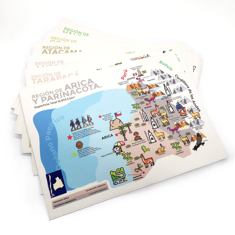Tenemos 17 individuales distitnos confeccionados en PU blanco, impresos full color con tinta UV