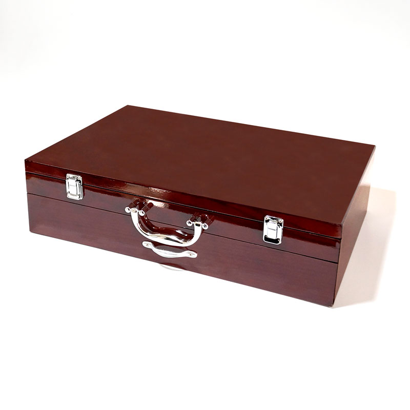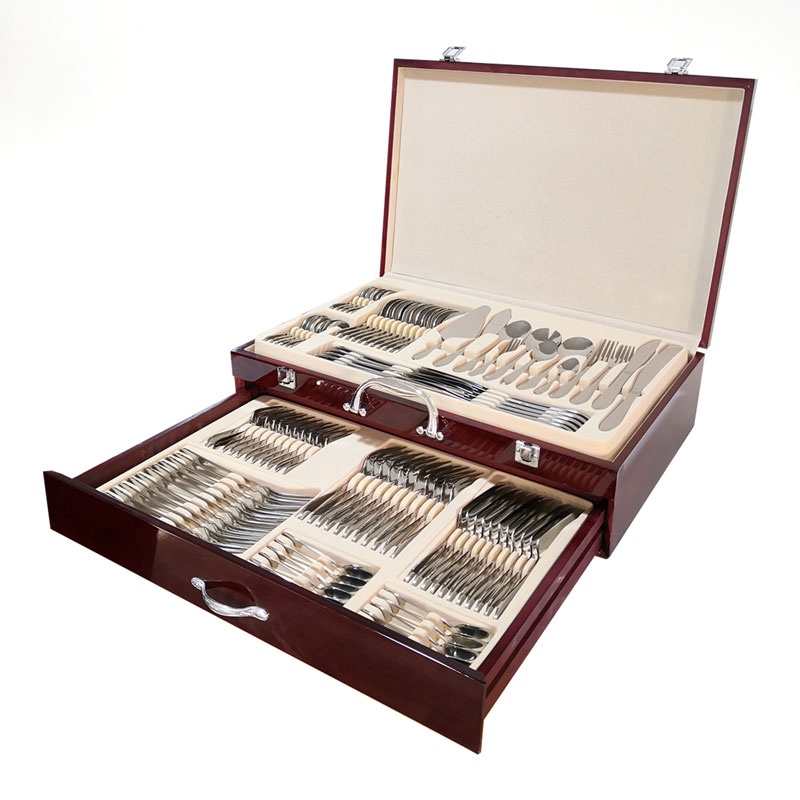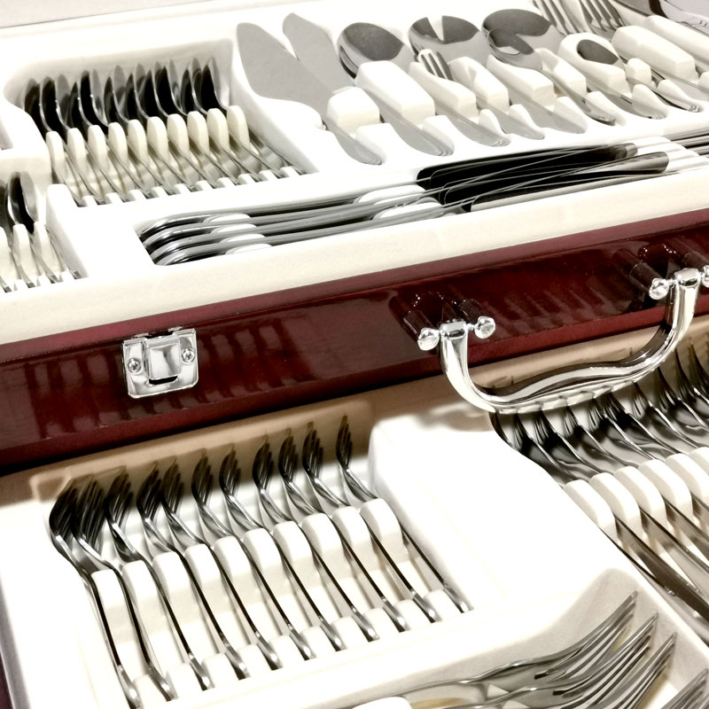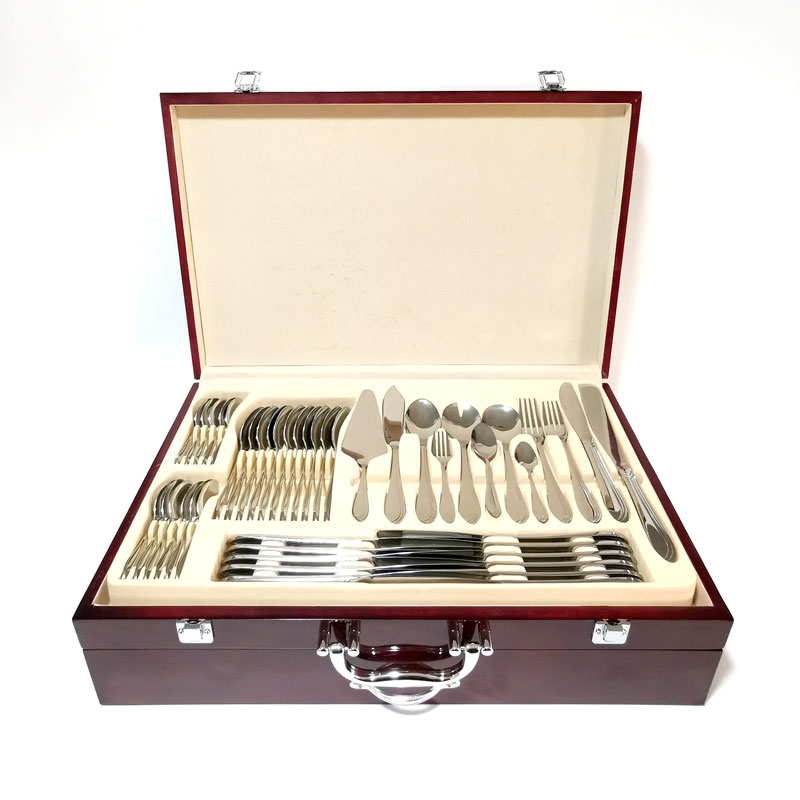 Elegante set de cuchillería inoxidable de 100 piezas color plata en maleta de madera vitrificada.
