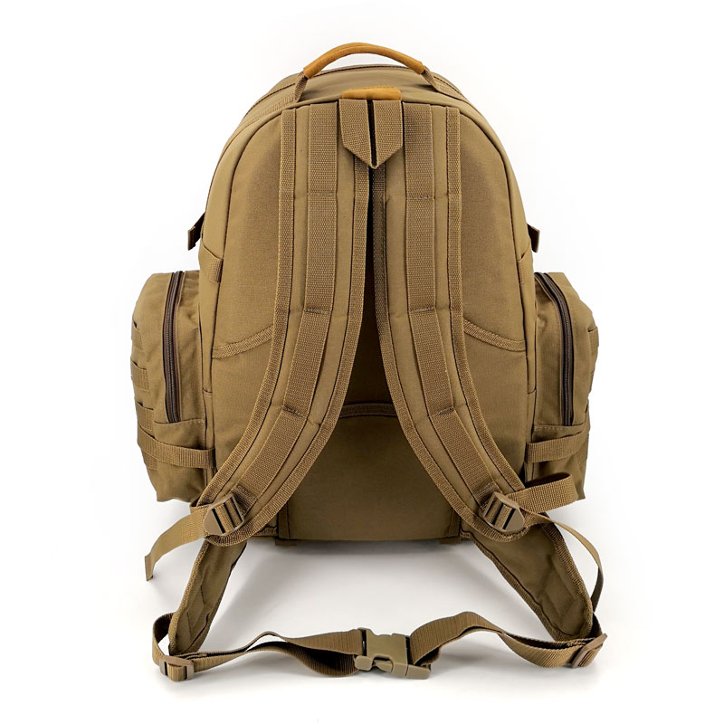 Confeccionado en tela cordura 1000D, color coyote y con hilo nylon de alta densidad,  cierre de nylon con doble carro, hombreras acolchadas, acolchado con espuma PE de alto impacto en la espalda, correas superior de transporte a mano y manillas acolchadas de alto impacto, Correas inferiores y laterales multipropósito de alta resistencia poliéster nylon 2,5 cms, Tip-top de 2,5 y 3,8 cms y escalerilla de 2,5 cm de alta resistencia color coyote, bolsillos laterales con cierre y con cinta reforzada de alto impacto, medidas aproximadas del bolso: 36 cm x 50 cm x 20 cm.