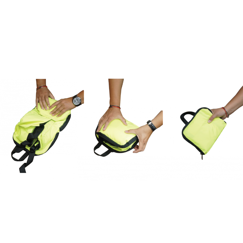 Mochila switch, deportiva plegable confeccionada en tela oxford impermeable de fácil lavado. Compartimiento principal con cierre y bolsillo delantero. Cierres color negro. Costuras reforzadas. Además posee una manilla superior para facilitar transporte. Tirantes reforzados. Se pliega dentro de su pequeño bolsillo quedando pequeña y compacta para facilitar su traslado. También, es ideal para el transporte de vestuario deportivo y/o accesorios mientras se practica una actividad deportiva como bicicleta, running, caminata, etc. el color flúor le da un carácter reflectante para el uso en la noche o en lugares con poca luz.