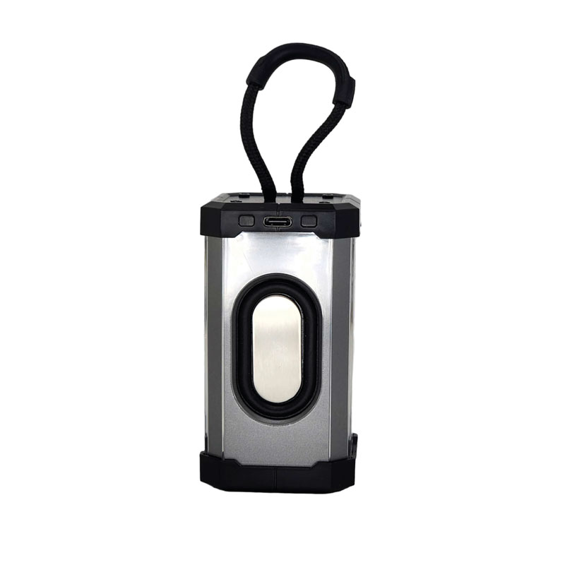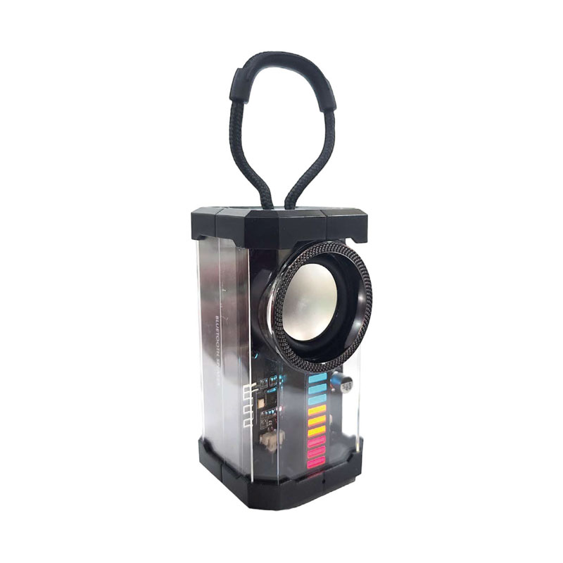 Parlante portátil tipo Retro, con estilo Mecha, excelente sonido, en claros y bajos, la cual expone parte de sus circuitos en superficies trasparentes, con parlante anillado y Barra de luz tipo disco en base a luces RGB,
