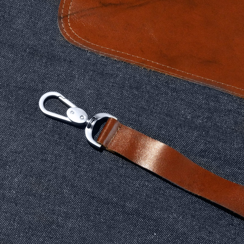 - Aplicaciones de cuero castaño en tirantes, bolsillos y detalles laterales.