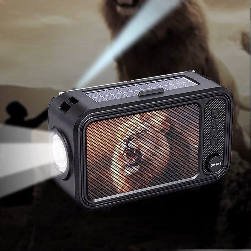 Radio portátil, recepción de señal FM con doble antena, conexión bluetooth. Viene incorporada una linterna con múltiples modos de iluminación con un alcance de 100m. Carga solar.